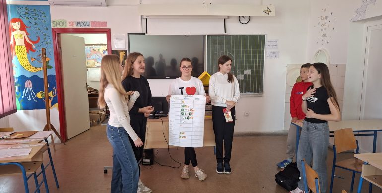 Radionica je započela energizerom “Pogodi vrtlara”, kroz koji su se učenici razgibali, ali i prisjetili svih važnih koraka u vrtlarstvu – od kopanja i grabljanja, do sijanja i zalijevanja. Kroz igru su osvijestili koliko je truda potrebno da bi od sjemena došli do ploda. Potom je uslijedila prilagođena verzija poznate igre “Voćna salata”, no s posebnim naglaskom na lokalne i sezonske namirnice. Umjesto egzotičnog voća, učenici su koristili voće karakteristično za njihov kraj – poput jagoda, trešanja, smokava, mandarina i maslina.