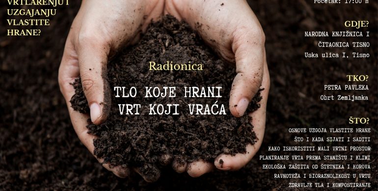 Veselimo se najaviti radionicu posvećenu ekološkom vrtlarenju i kompostiranju pod nazivom „Tlo koje hrani – vrt koji vraća“, namijenjenu odgojno-obrazovnim djelatnicima, organizacijama civilnoga društva te svim zainteresiranim građanima.
